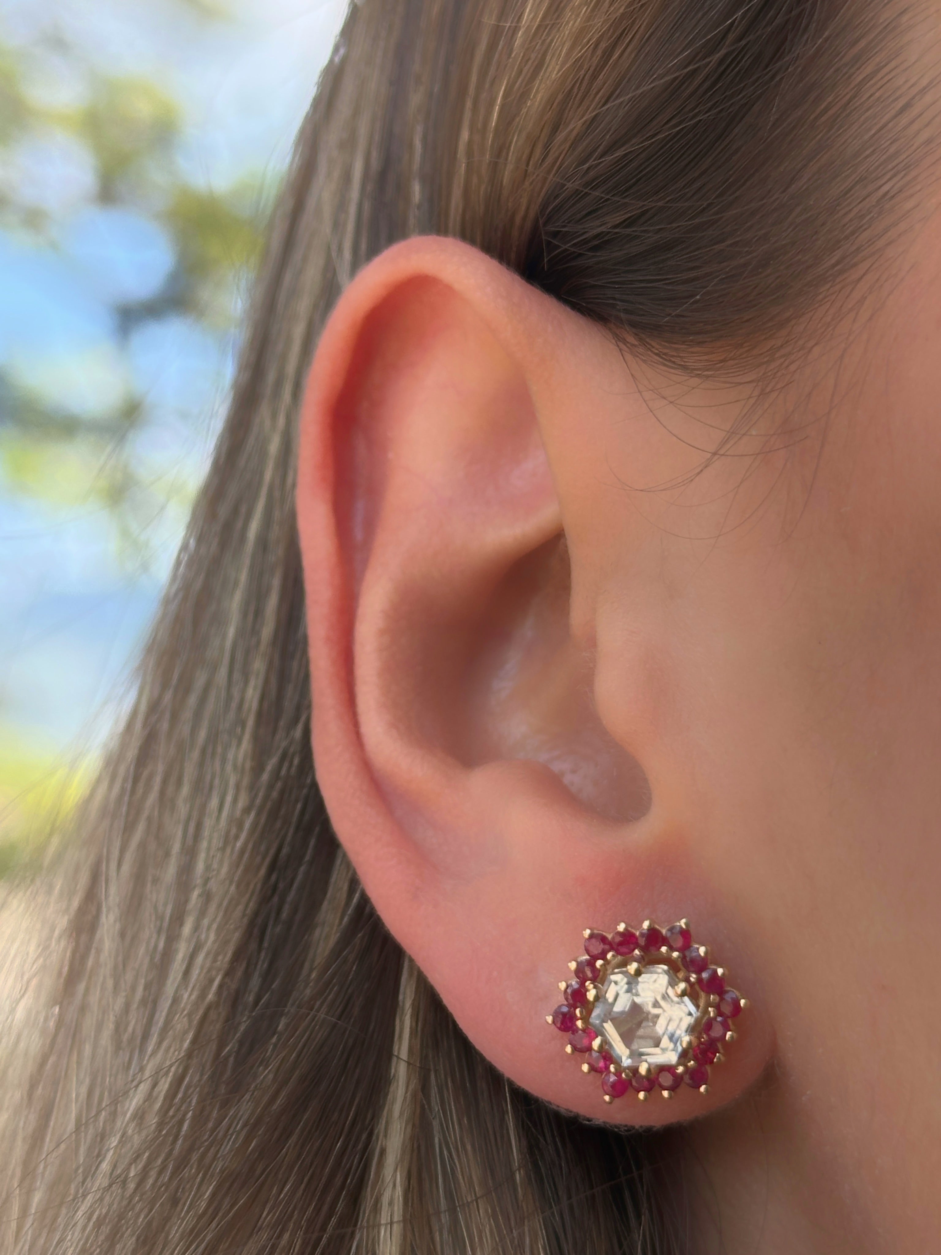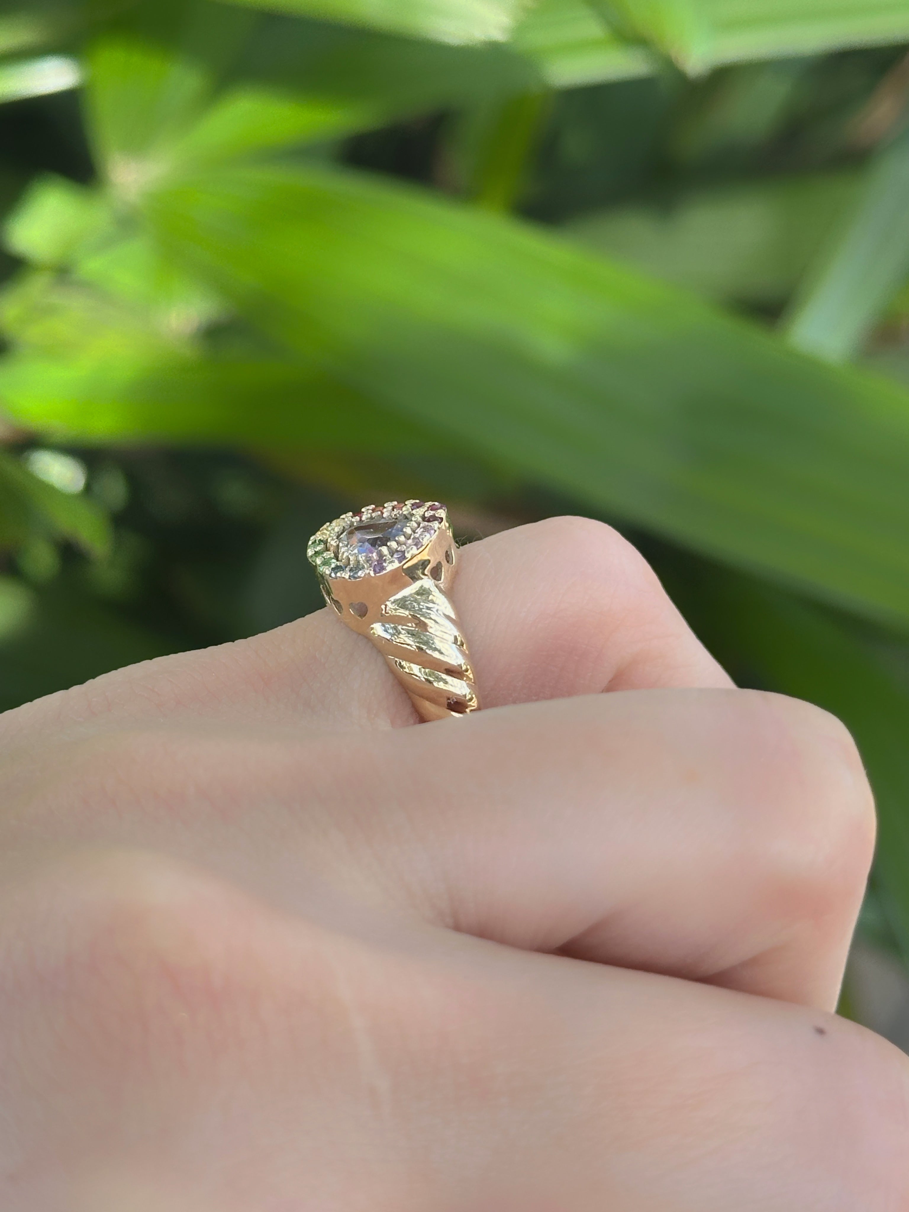 Anillo Maranta redondo rubíes halo y cluster en diamantes