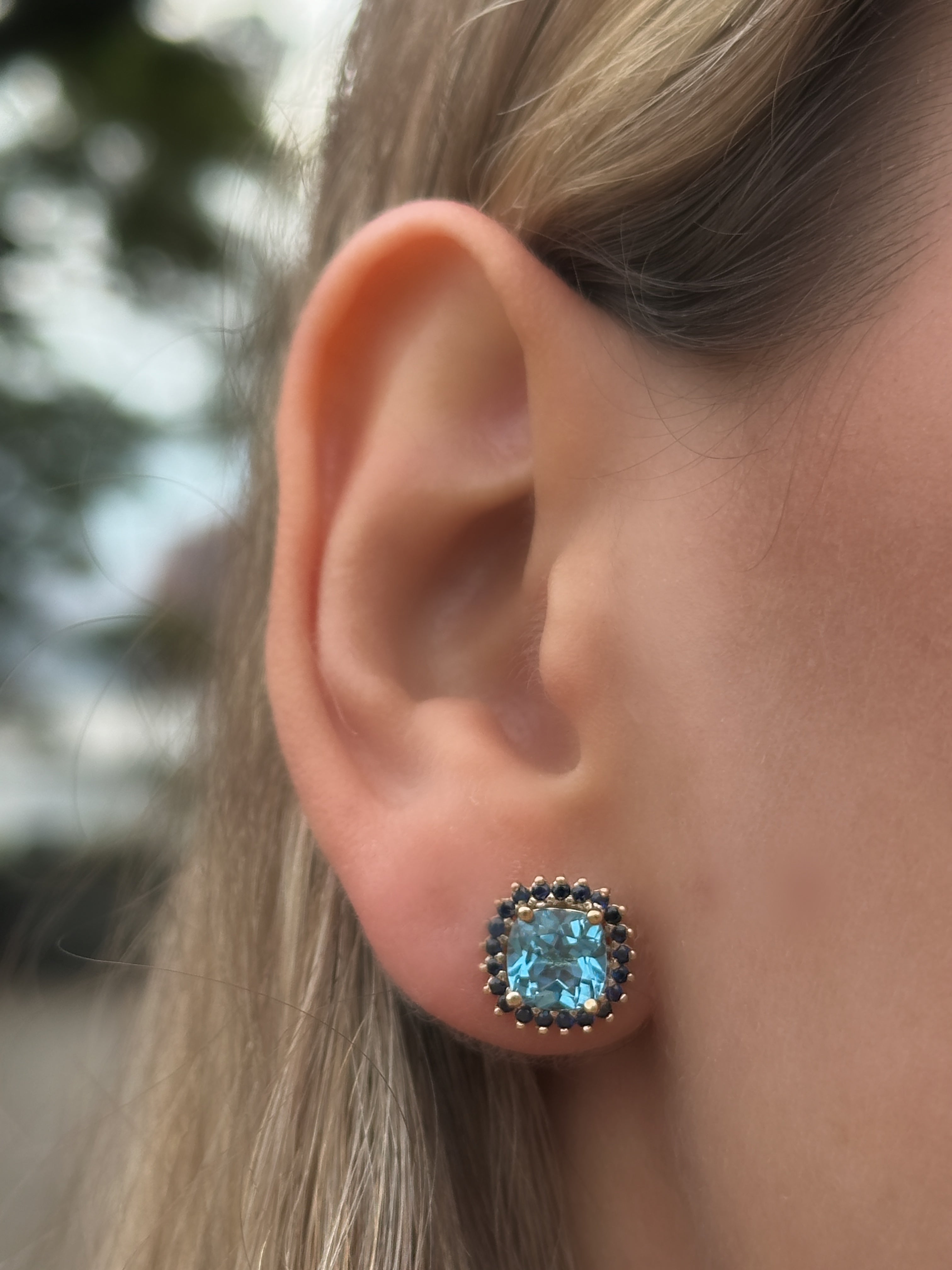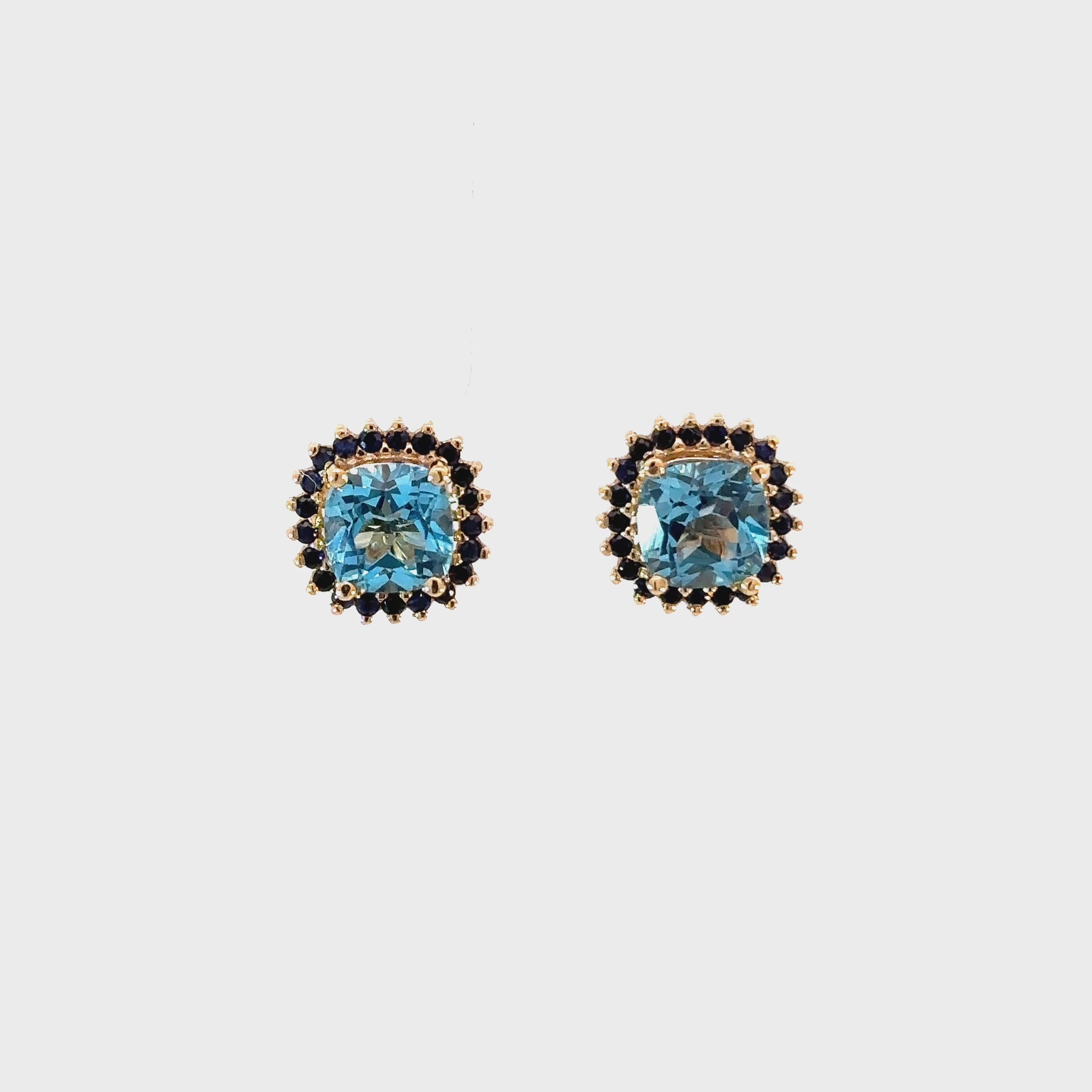 Aretes Cushion topacio Swiss blue y zafiros azules
