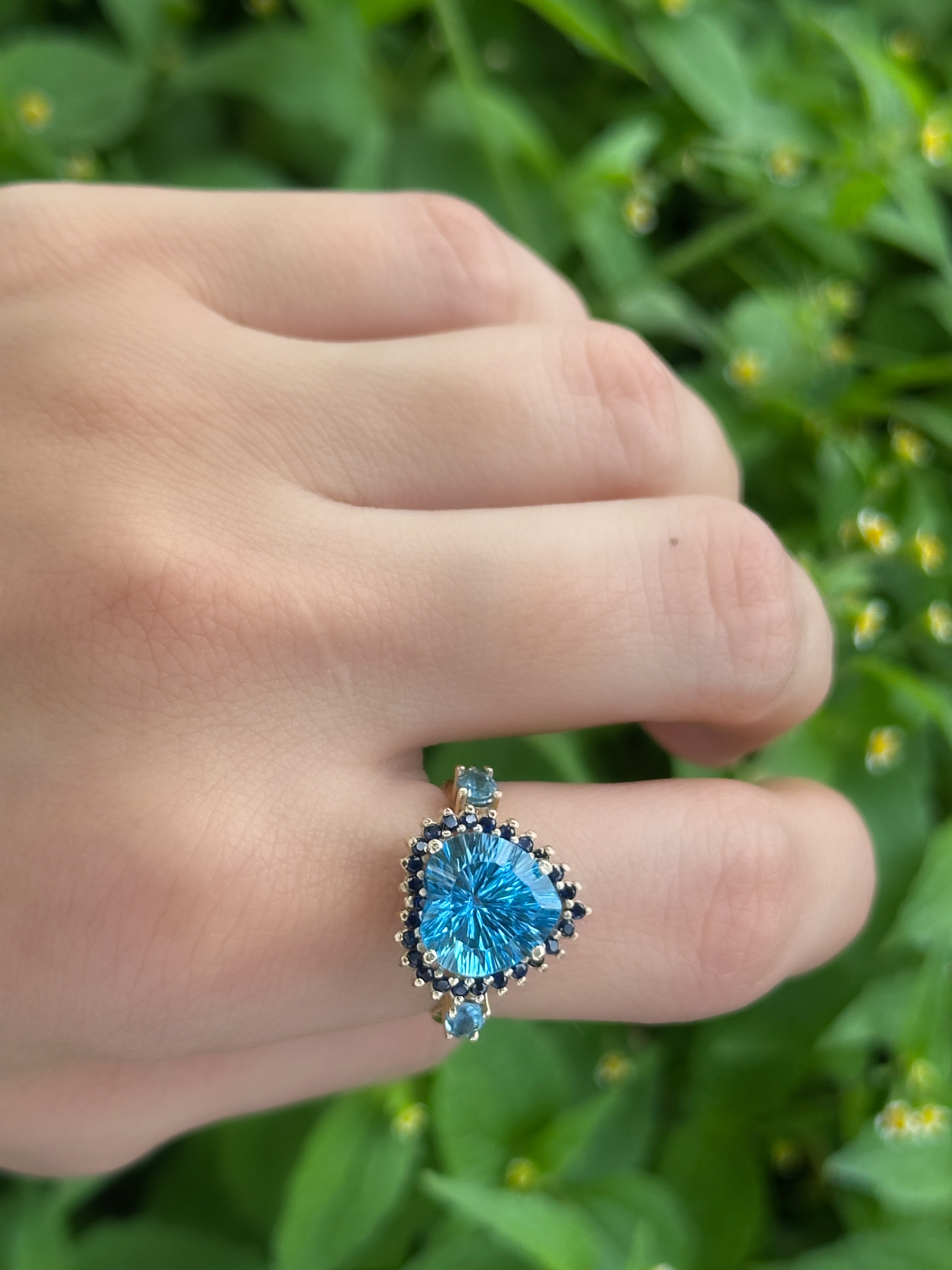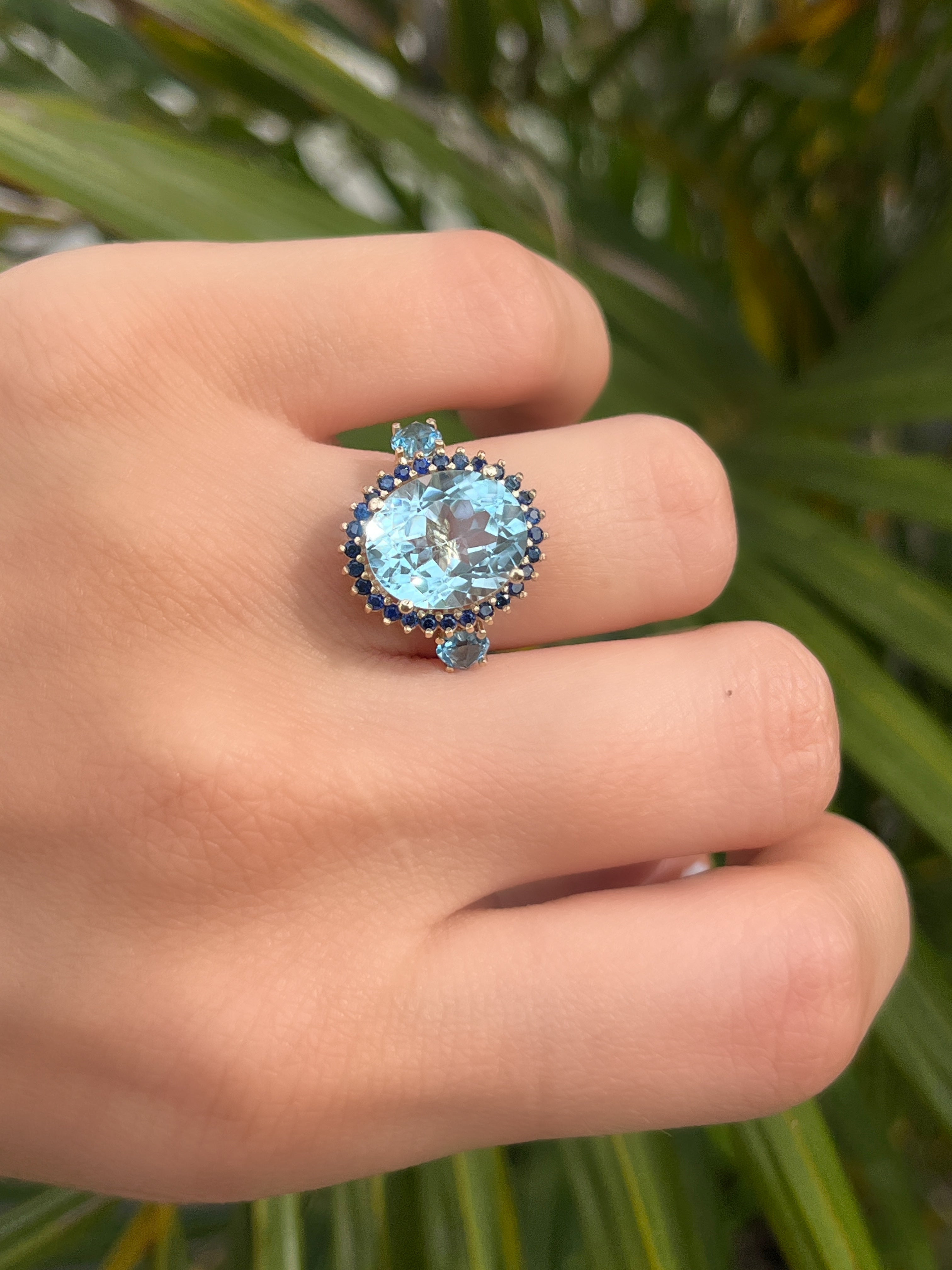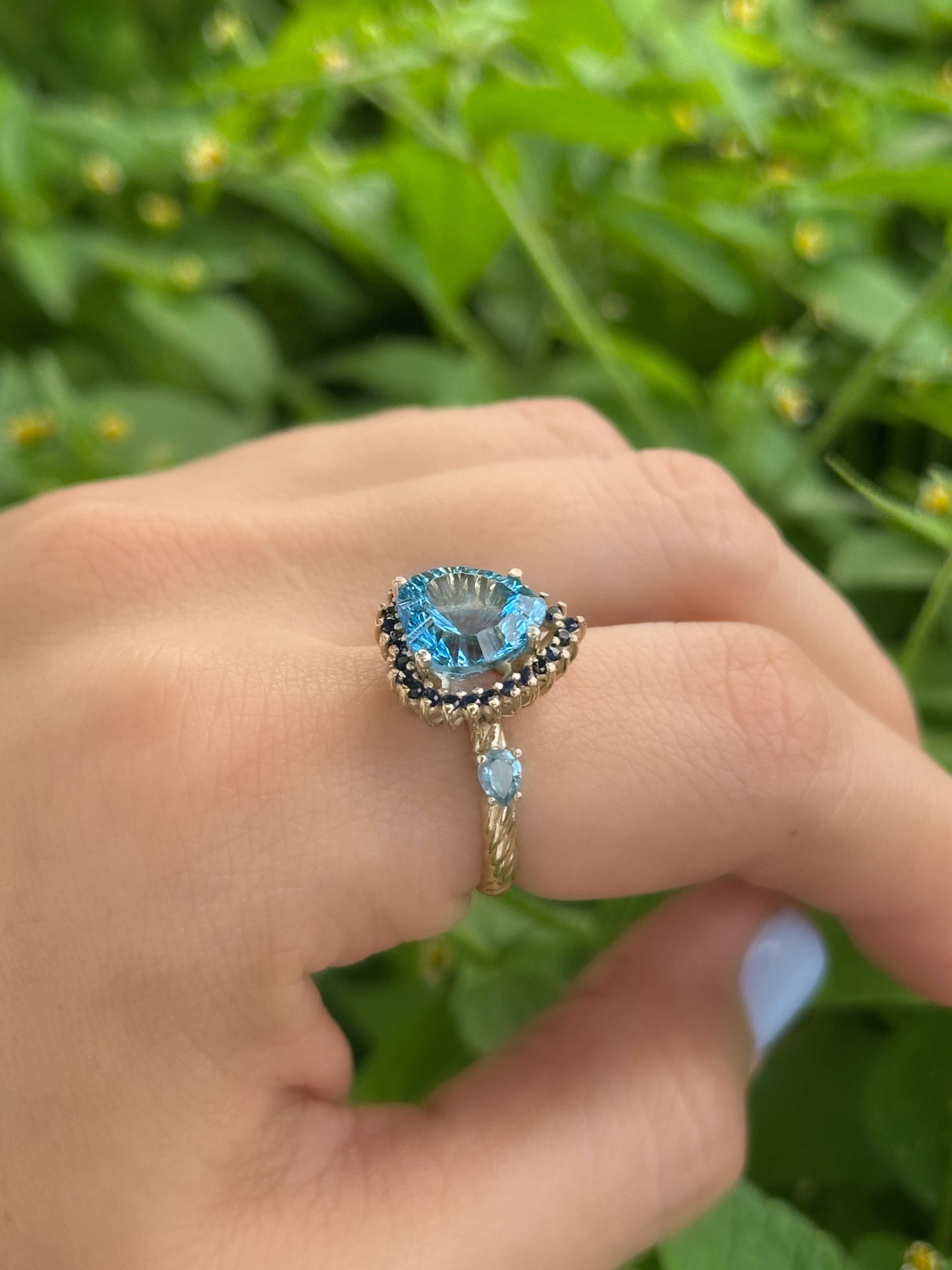 Anillo cluster topacio swiss blue y zafiros azules